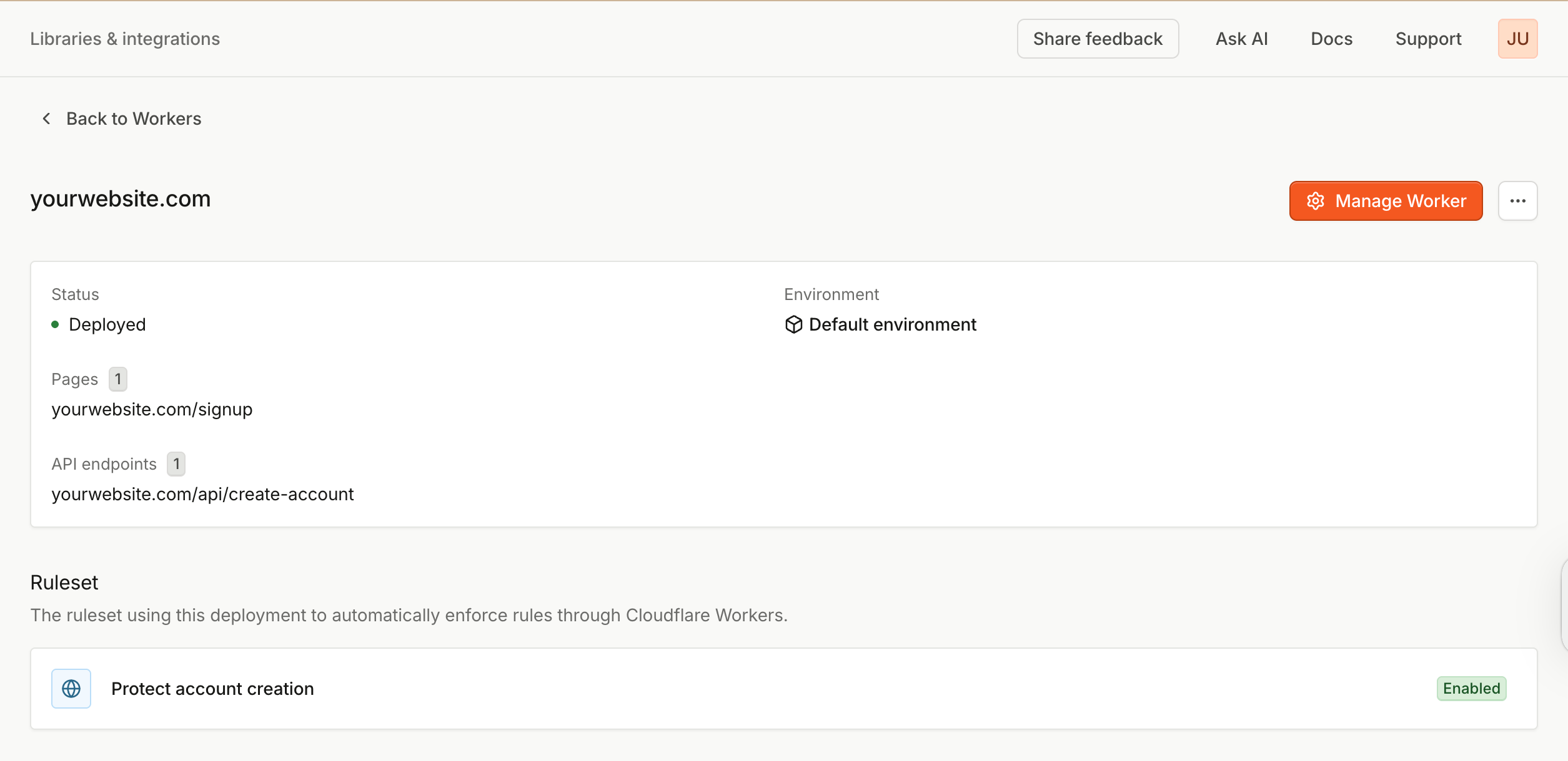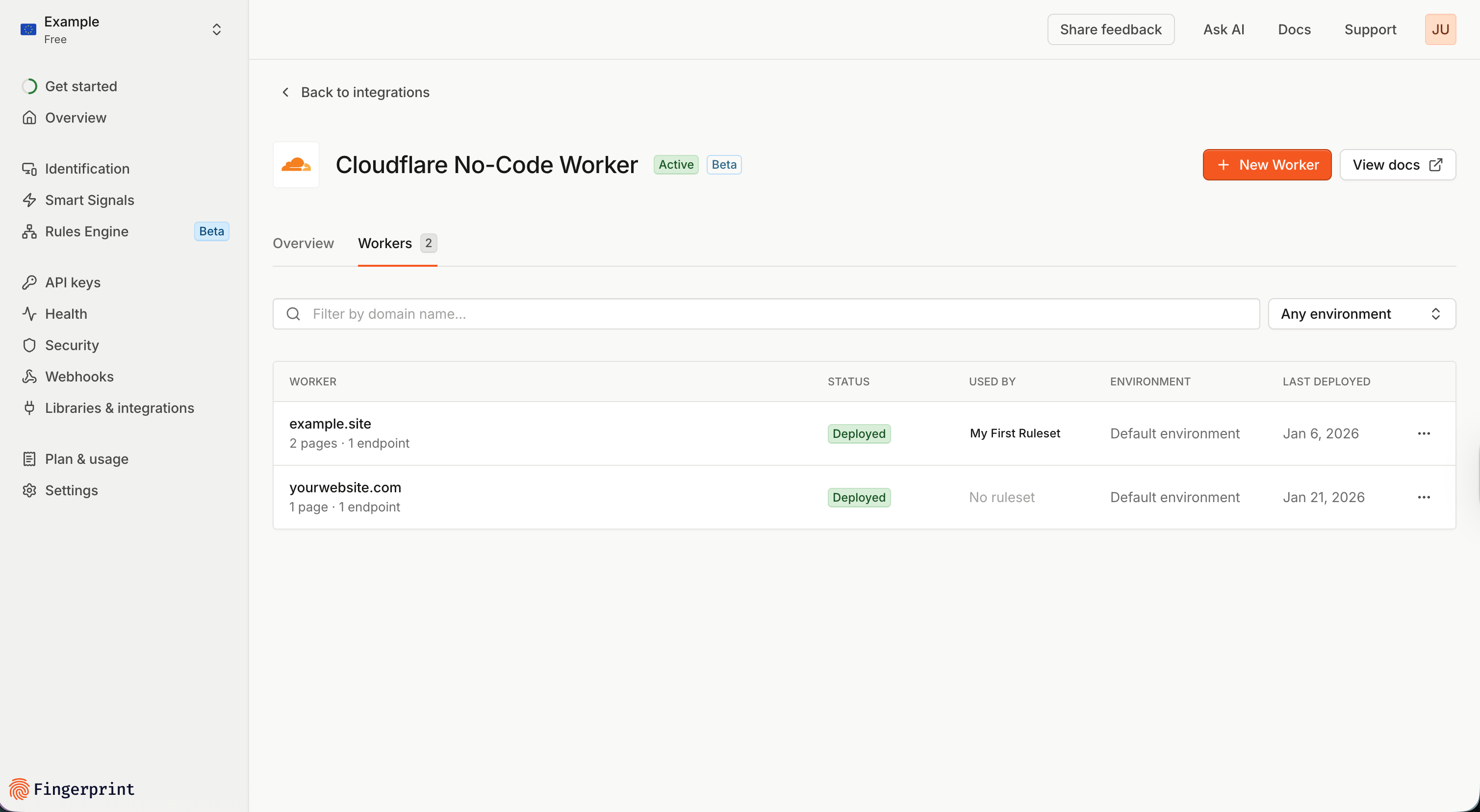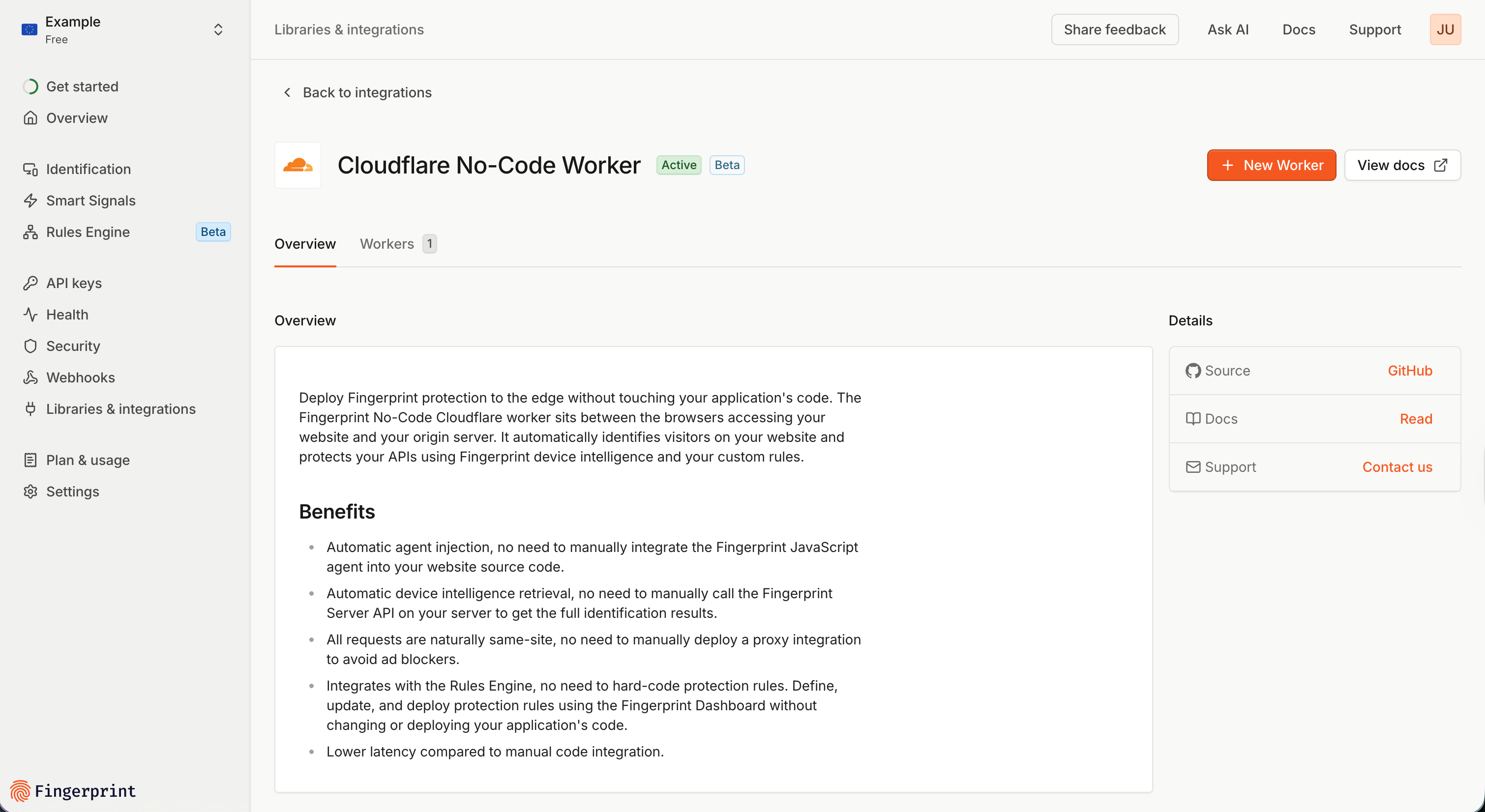 - In the Fingerprint Dashboard, navigate to Libraries & integrations -> Cloudflare No-Code Worker.