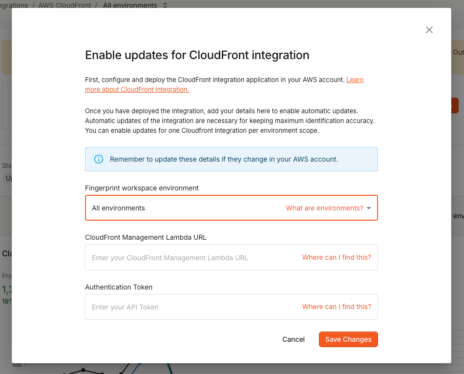 Keeping the integration up to date is crucial for maintaining maximum identification accuracy. To enable automatic updates, provide the following Management function settings from AWS to the Fingerprint dashboard: