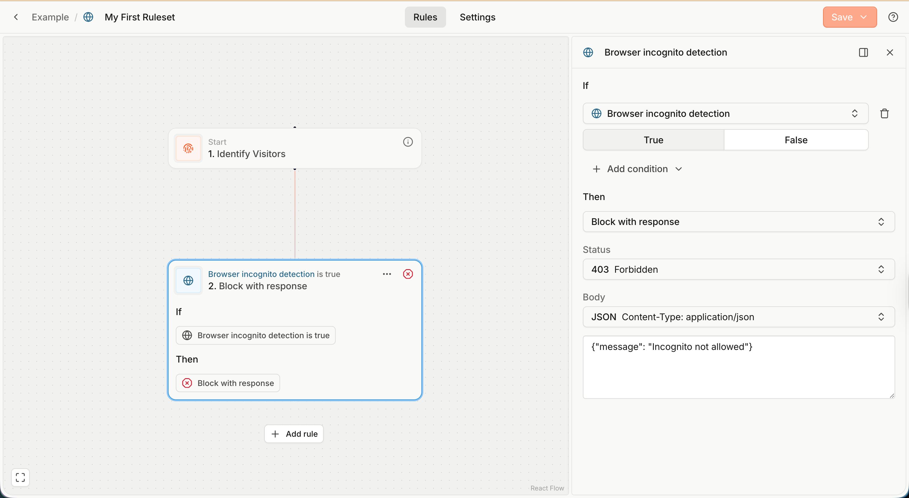 - Choose the Browser incognito detection Smart Signal as the rule condition.
