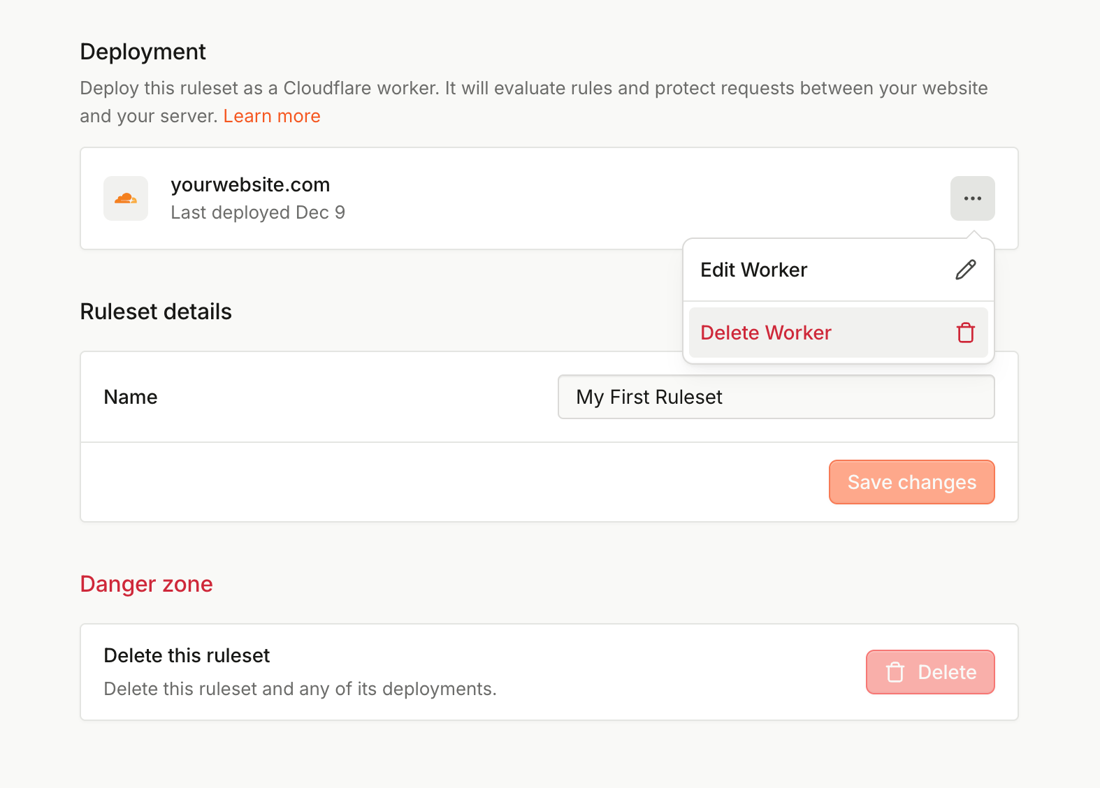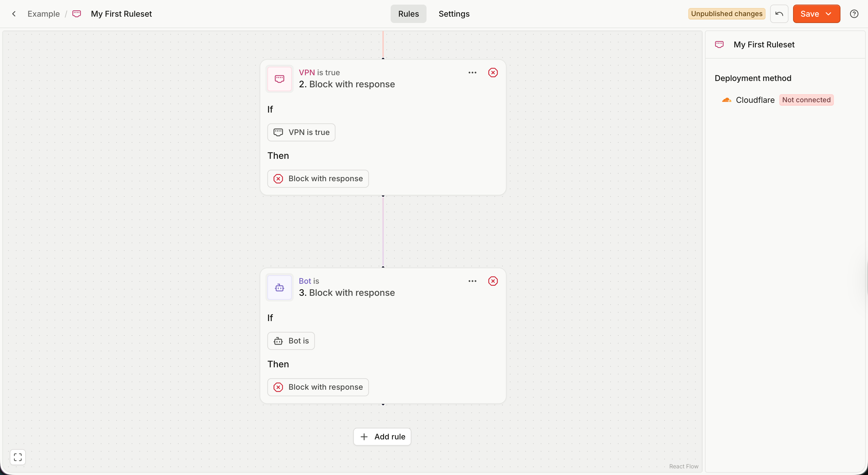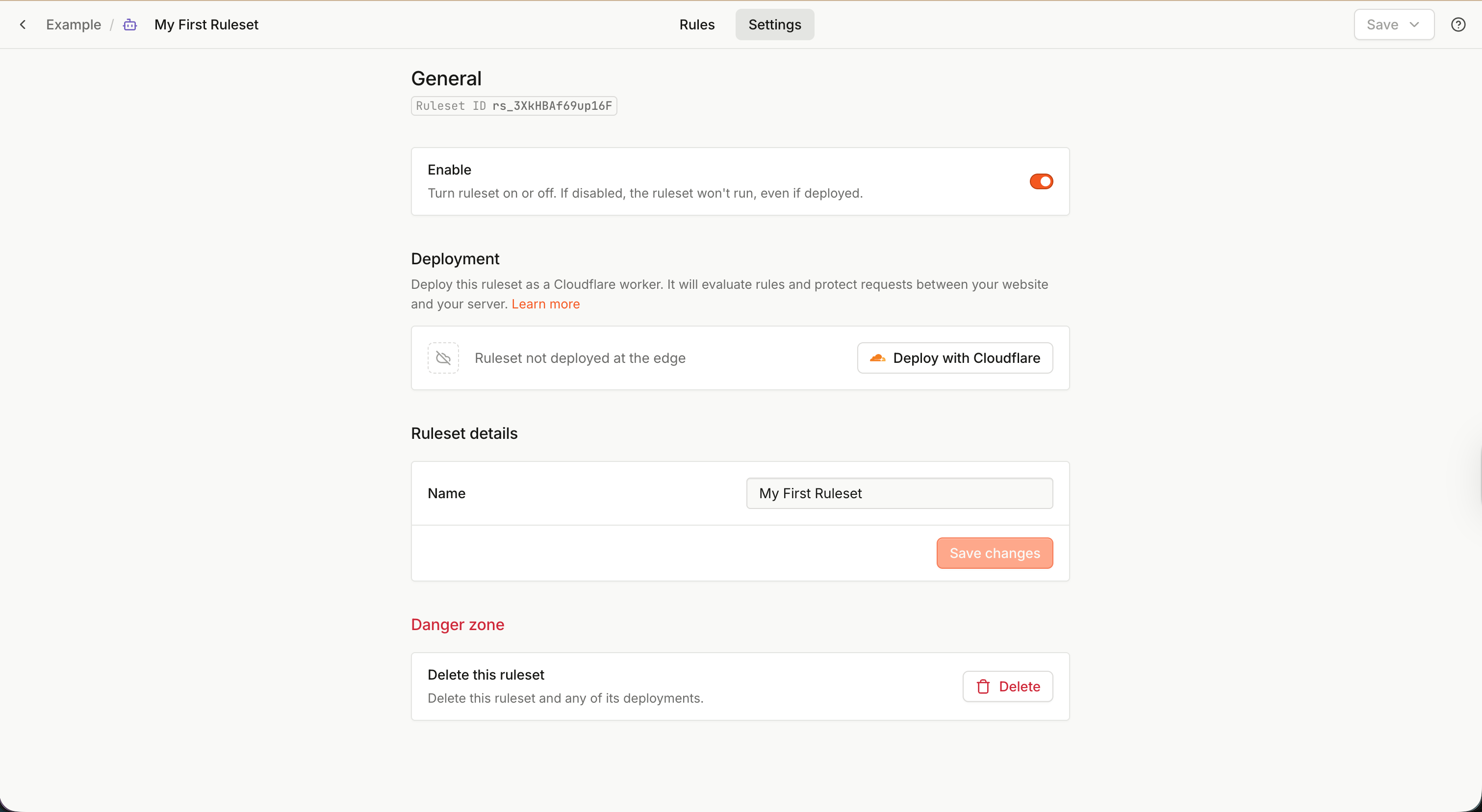 An undeployed ruleset is just a row in the Fingerprint database. To actually use the ruleset, you can deploy it to Cloudflare using a Flow worker.