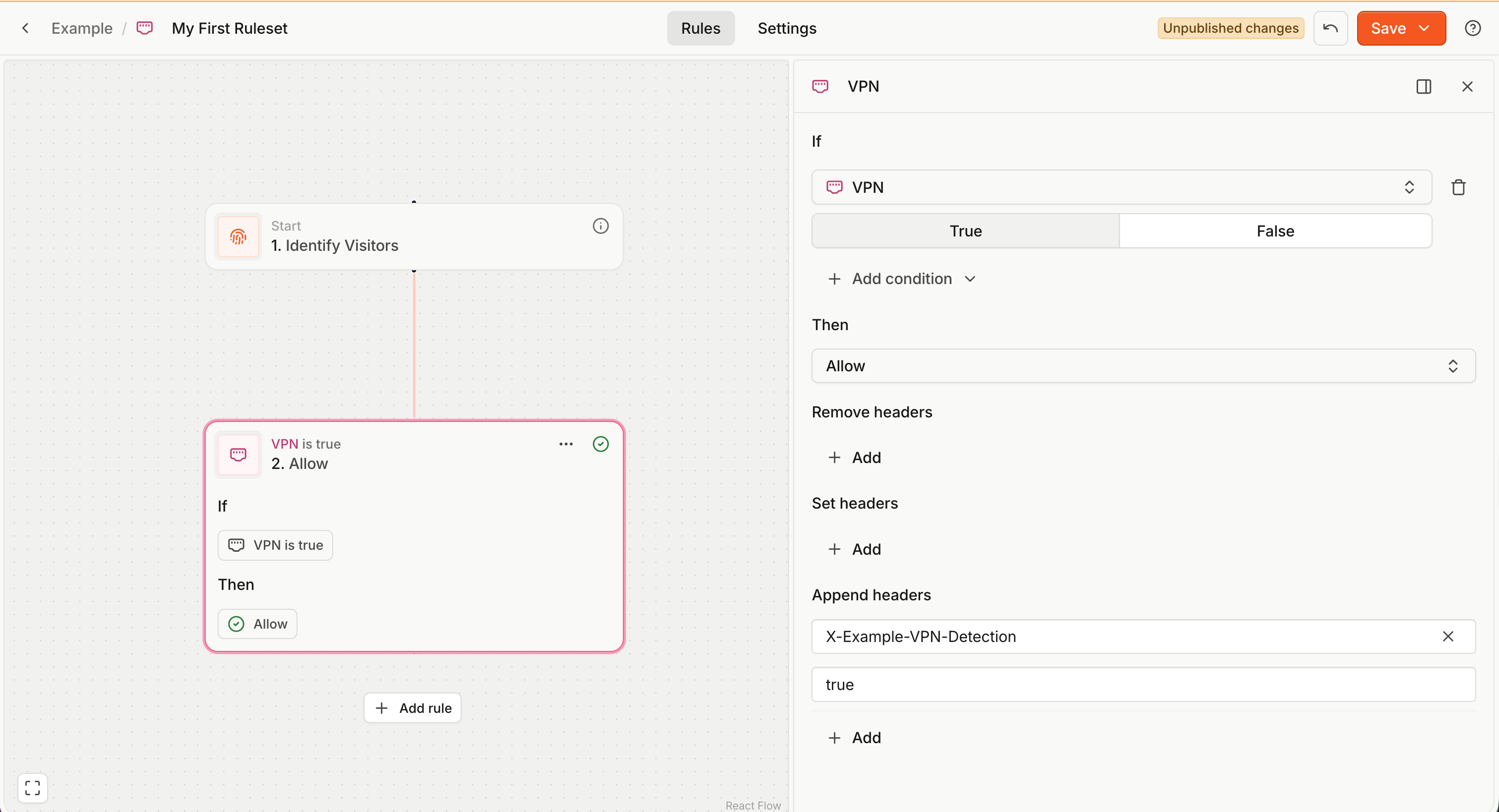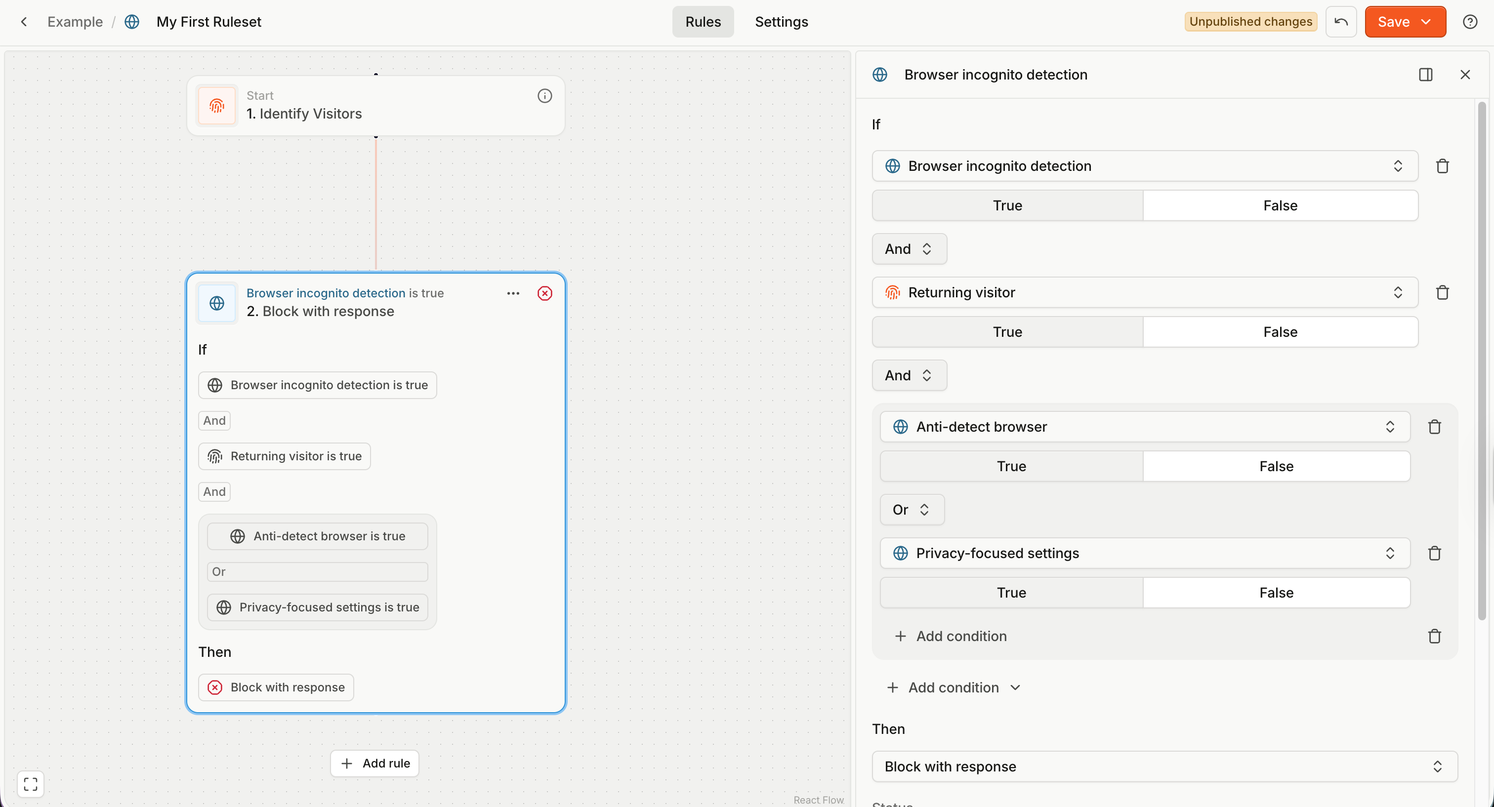 IF VPN is TrueIF Suspect Score is greater than 10 AND IPv4 Country Code is CNIF Incognito Mode is True AND Returning visitor is True AND (Anti-Detect Browser is True OR Privacy-focused Settings is True)