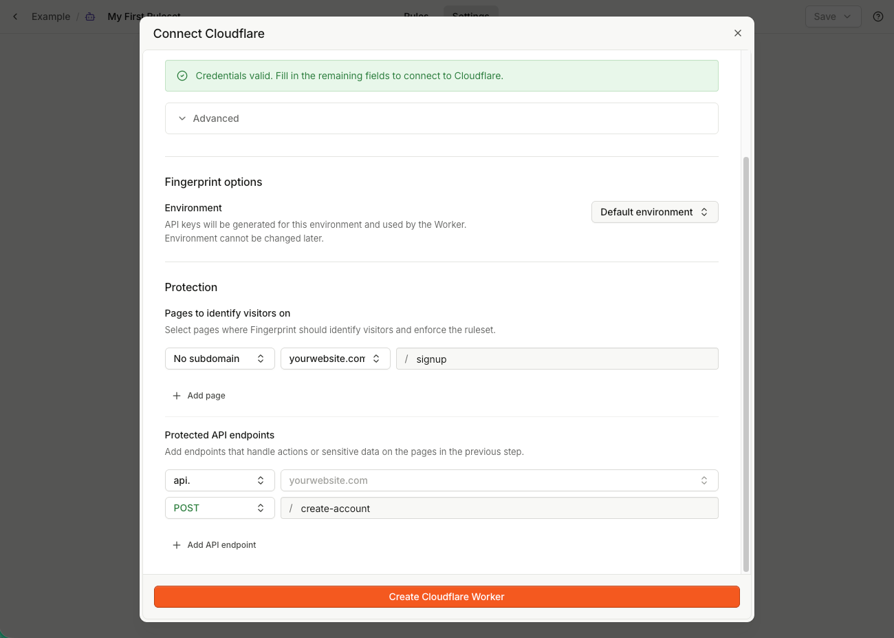 For example, you can deploy the ruleset defined above to protect the POST api.yourwebsite.com/create-account API, called from the yourwebsite.com/signup page.